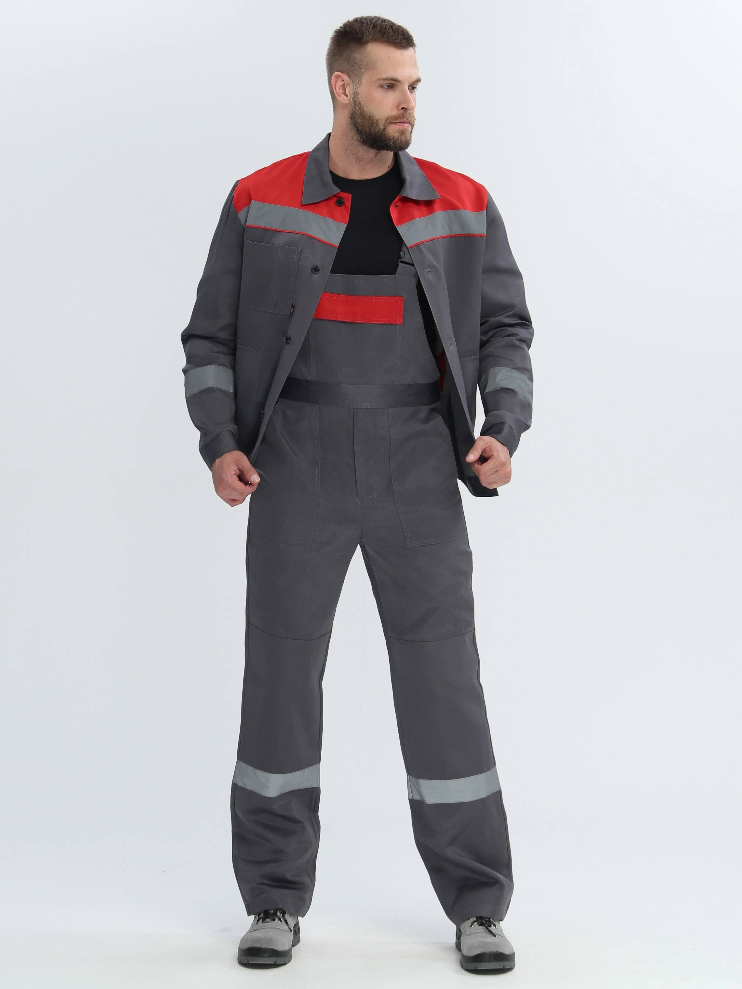 Рабочий костюм с полукомбинезоном темно серого цвета с вставками светло-серого цвета. Спецодежда изготовлена по ГОСТ 12.4.280.2014, что подтверждает высокое качество рабочего костюма. Купить рабочий костюм можно на сайте 6161.by. Рабочий костюм мужской.